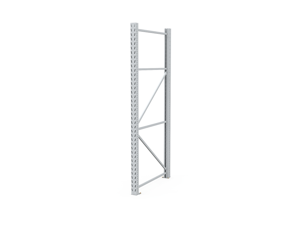- Рама стеллажа состоит из двух стоек Р100х2,0 мм, комплектов диагональных и горизонтальных связей, подпятников (для анкерного крепления к полу) и крепежа