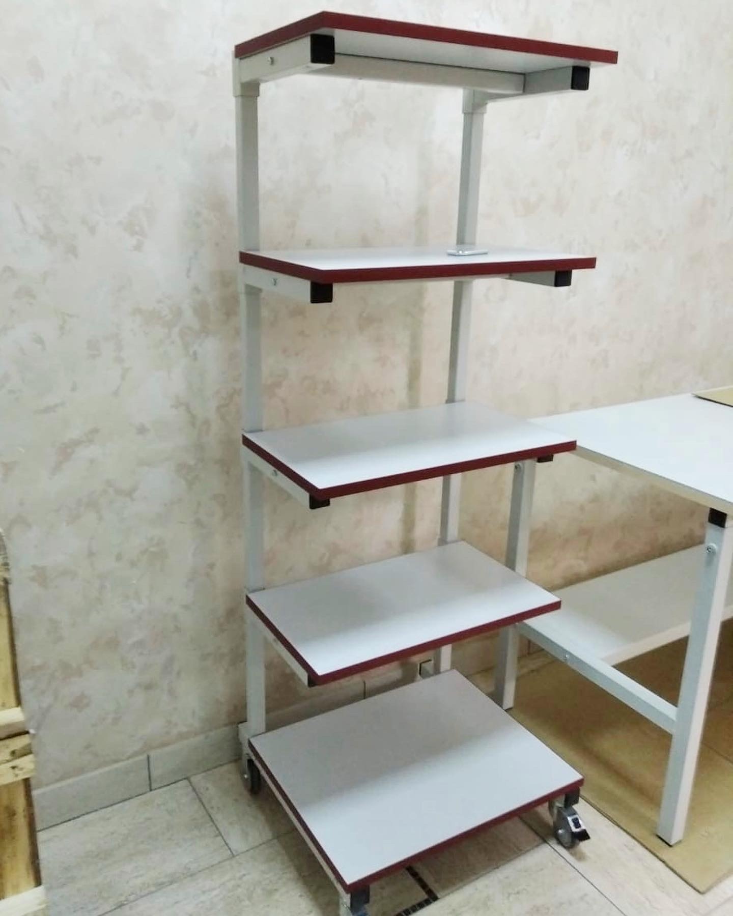 Стойка оснащена четырьмя колесными опорами, две из них с механизмом фиксации. Полки толщиной 25 мм изготовлены из ламинированного ДСП. Износостойкое покрытие из промышленного пластика обладает высокой стойкостью к термическим и механическим нагрузкам. Цвет боковой кромки полки фирменный бордовый, под заказ любой другой на Ваш выбор.