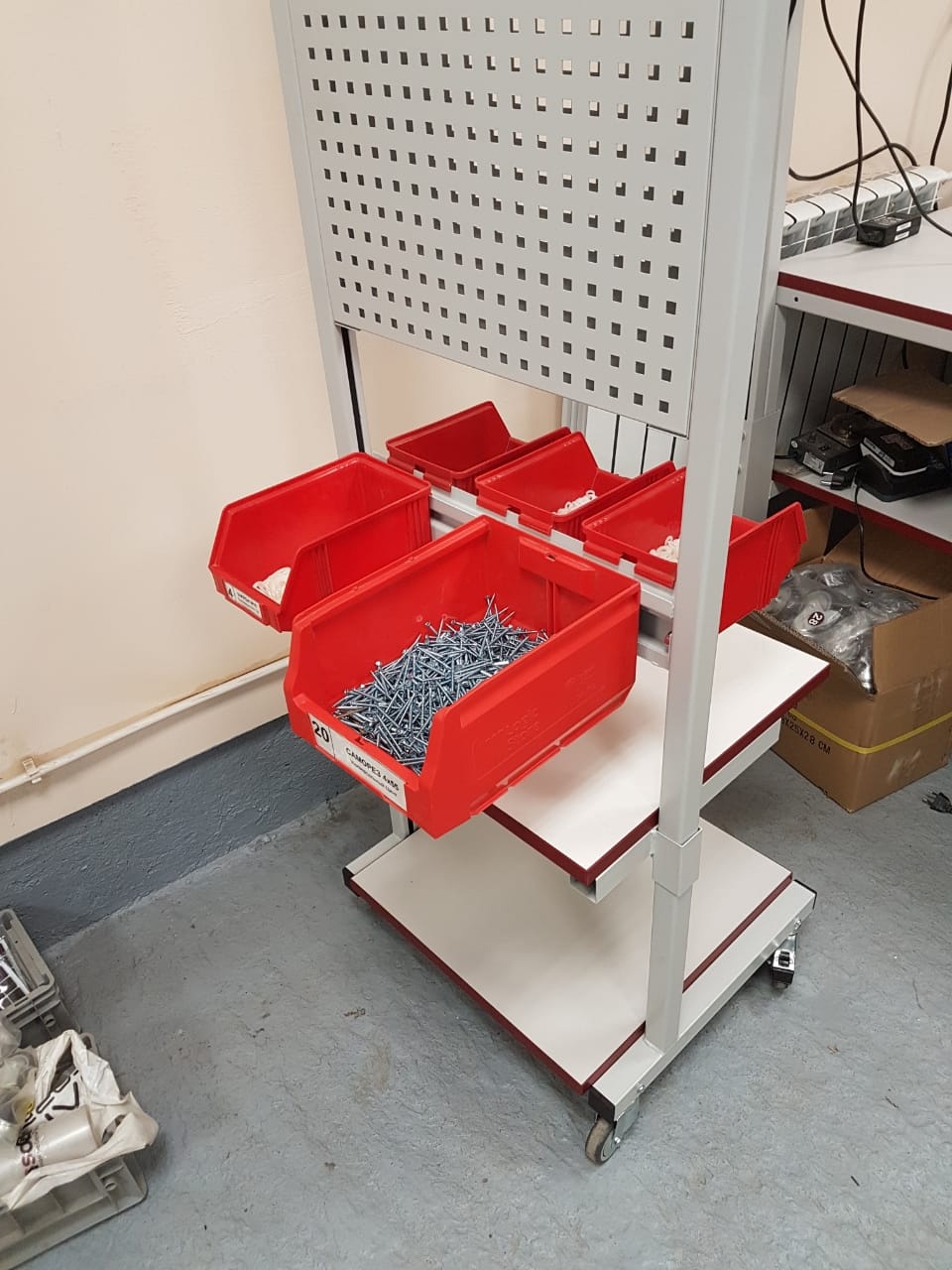 Стойка подкатная универсальная СПУ используется для хранения и перемещения инструментов, материалов и комплектующих в рабочем пространстве. В стандартной комплектации стойка поставляется в комплекте с полкой для оборудования ПОС, панелью перфорированной ППМ и планкой для лотков ПЛМ (2 шт.). Возможно зеркальное (двухстороннее) размещение планок для лотков и перфопанелей. Регулировка высоты дополнительного оборудования осуществляется по боковым стойкам. Конструкция стойки позволяет оснастить ее дополнительным оборудованием — полками, перфопанелями и планками для лотков. Стойка мобильная имеет металлический каркас, окрашенный порошковой краской.