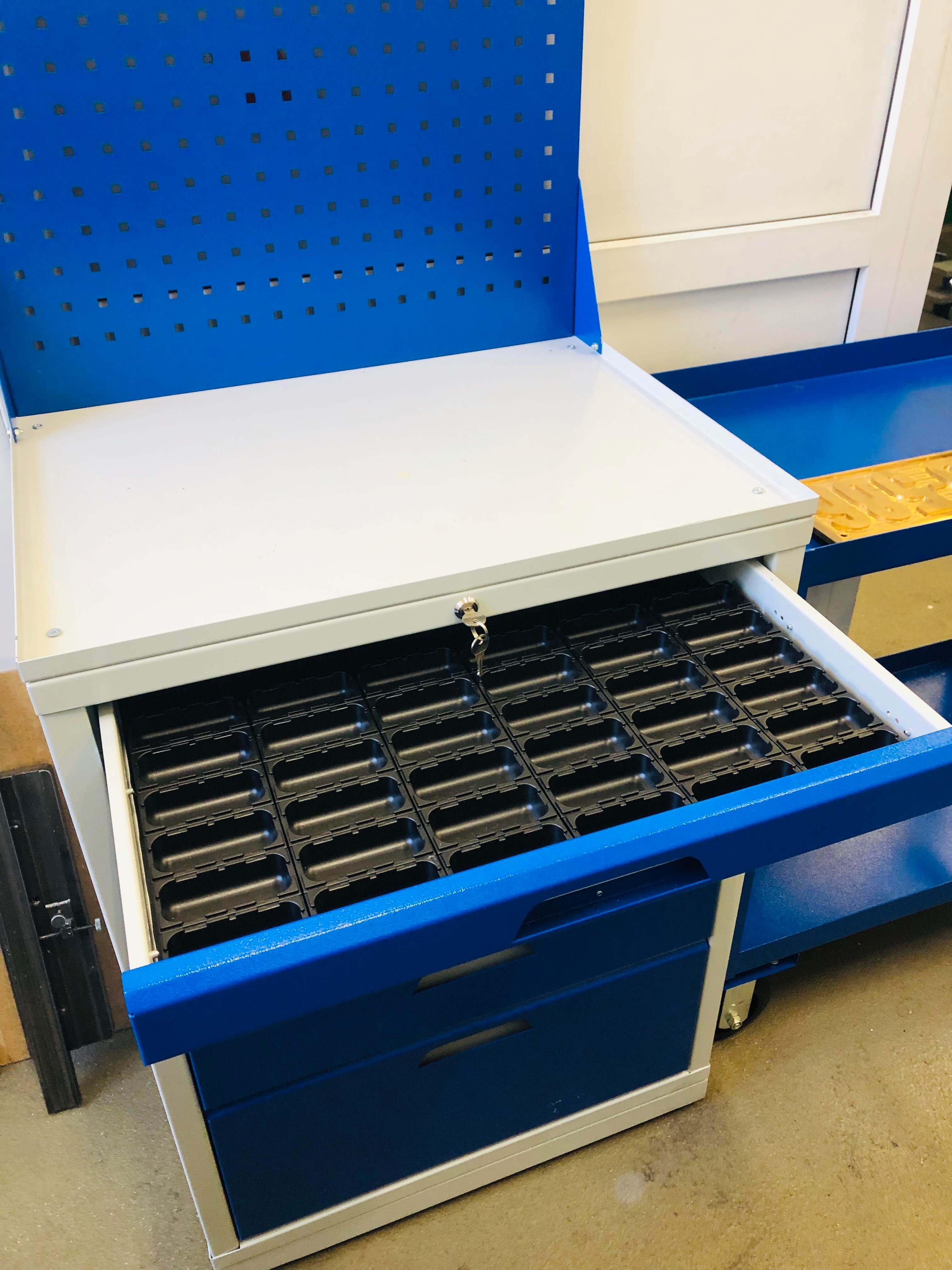 • Дополнительно на тумбы можно установить: столешницу из фанеры толщиной 30 мм, лоток с МБС резиной, экран перфорированный для наглядного размещения инструмента, а также два вида цоколей для транспортировки тумб и компенсации неровносттей пола